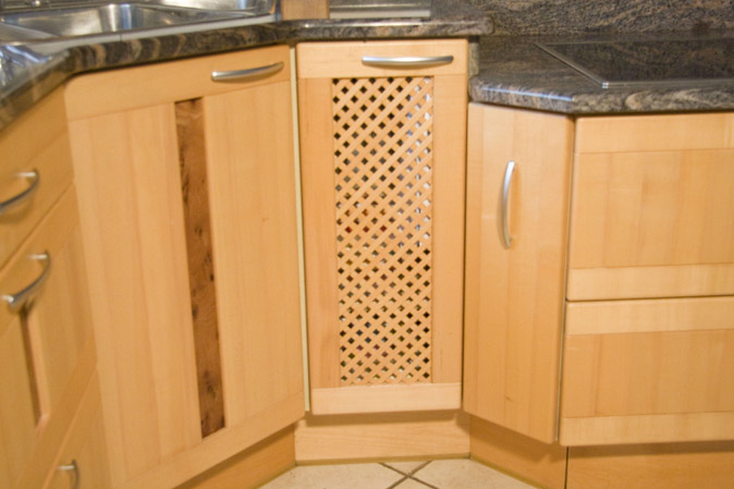 Details: Glas im Hängeschrank "Mastercaré", Gittergeflechttür, Herdbereich ist vorgezogen und abgesenkt, im Sockel integrierte Sockelschubladen